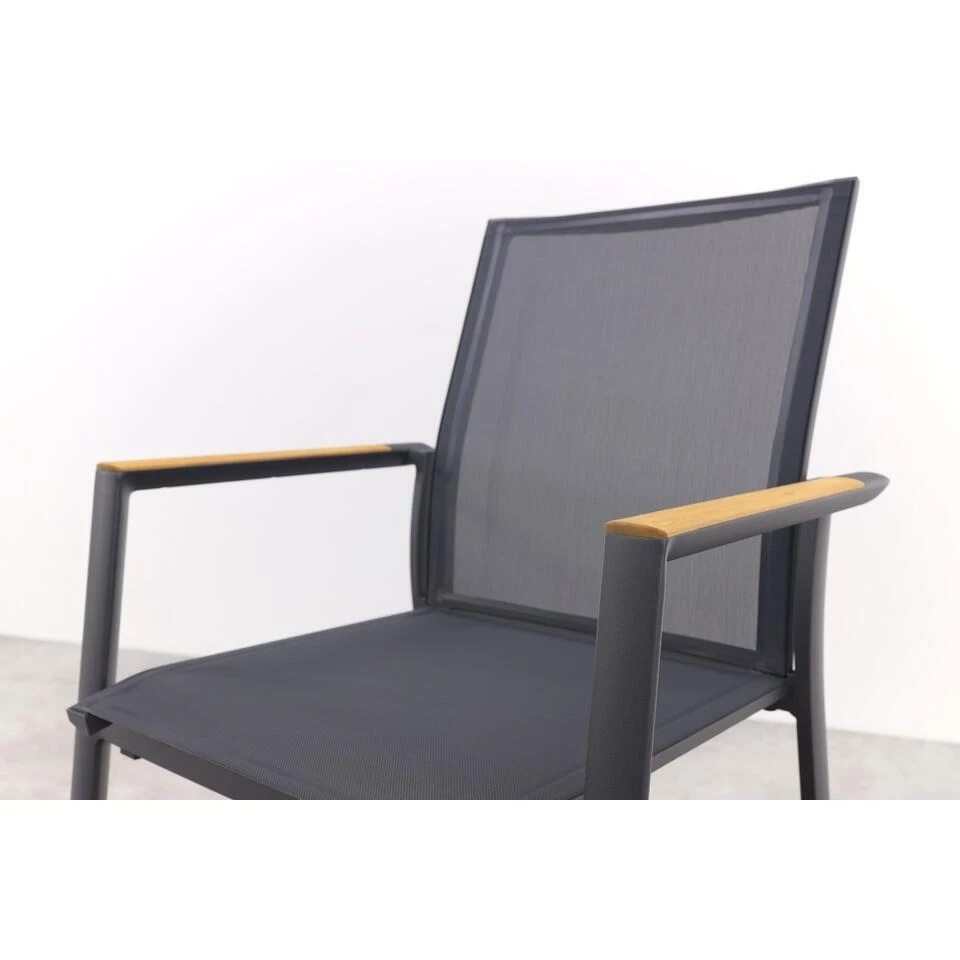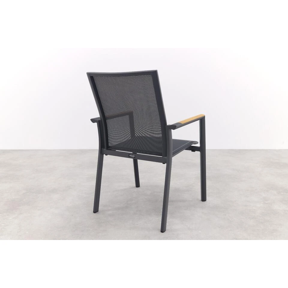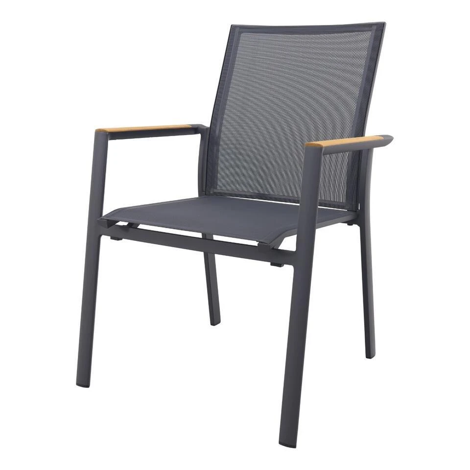 De stoel is makkelijk te verplaatsen omdat het frame van aluminium is gemaakt en daardoor licht van gewicht is. Om het frame extra te beschermen, heeft het een antracietkleurige poedercoating gekregen. Nu is de stoel ook verkrijgbaar met mooie armleuningdetails van teakhout. Dit maakt de stoel modern en warm tegelijk. De zit- en rugleuning van de Atmos stapelstoel zijn van textileen. Dit is een zacht en comfortabel geweven nylon draad. Dus, zelfs zonder kussen, zit de stapelbare tuinstoel van Atmos heel lekker.