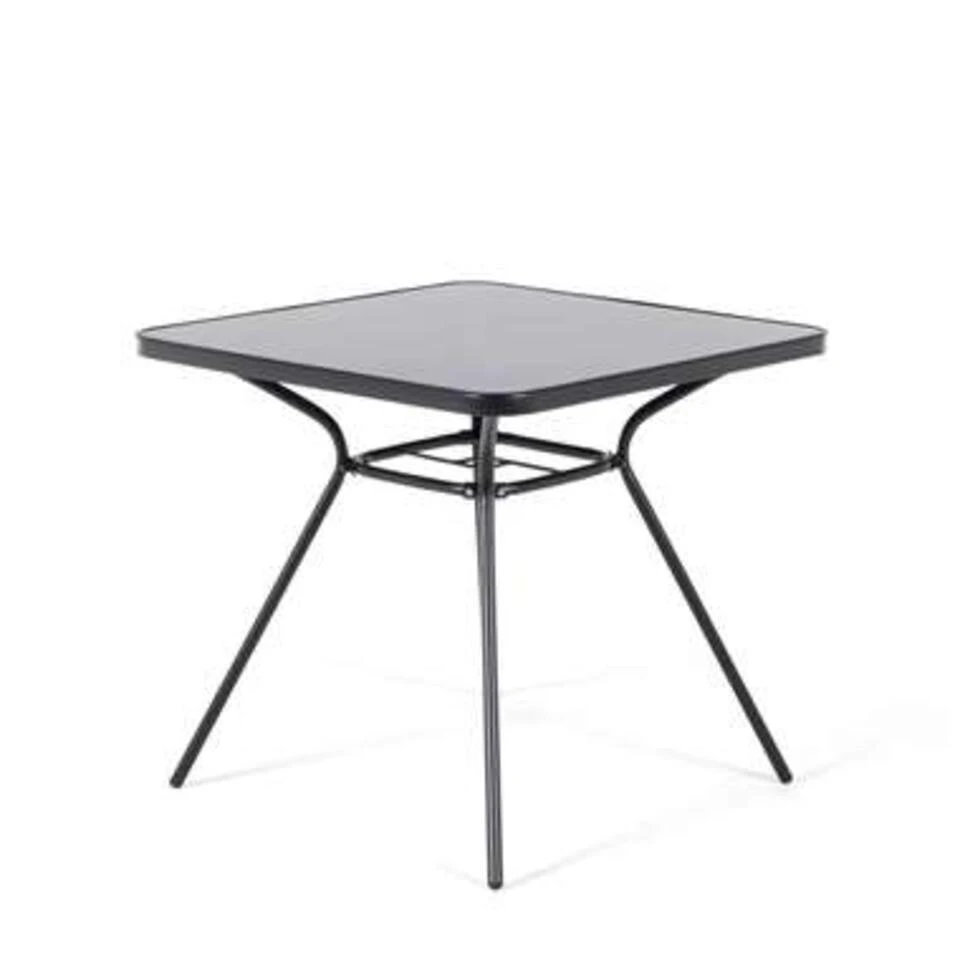 Moderne en praktische zwarte tuintafel. Ben je op zoek naar een kleine maar praktische tafel? Dan hoef je niet langer te zoeken. Deze veelzijdige tuintafel, gemaakt van gepoedercoat zwart staal met een dik, gehard glazen blad, is een perfecte oplossing. De gebruikte materialen zijn van hoge kwaliteit en gemakkelijk in onderhoud. 4 stabiele, sterke poten ondersteunen het geharde glazen tafelblad. Flexibiliteit met een modern design – de zomer kan beginnen!