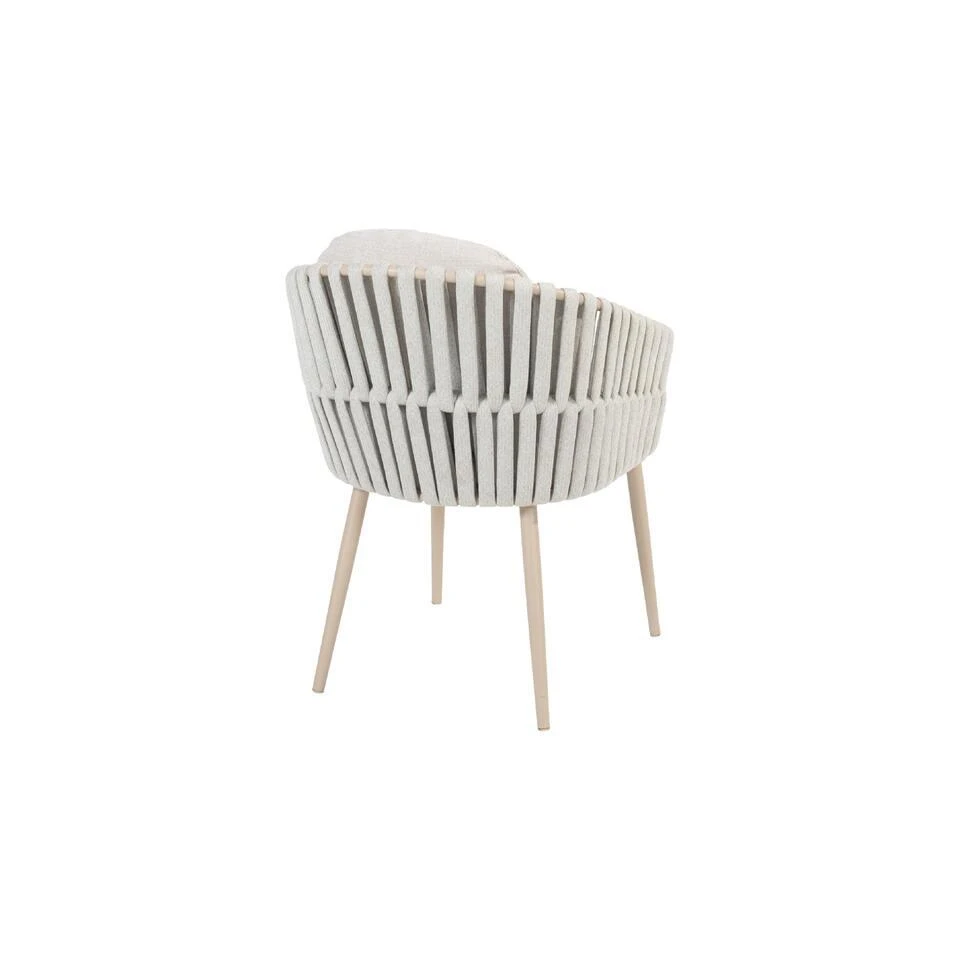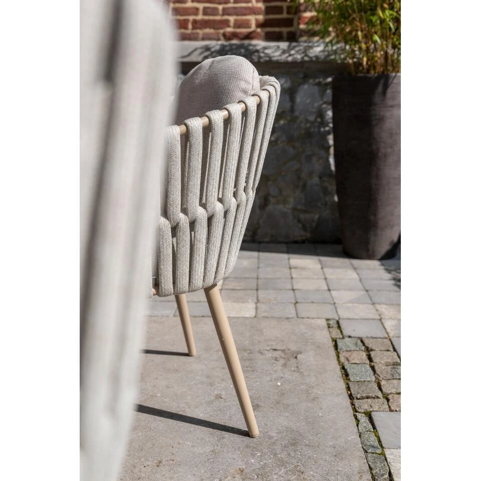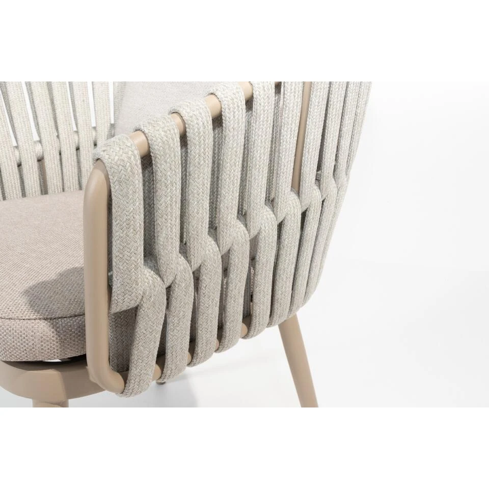 De Eva tuinstoel van Taste heeft een frame van aluminium. Een materiaal dat licht van gewicht is en een lange levensduur heeft. Dit aluminium heeft een poedercoating gekregen in de kleur ‘latte’. Een beige kleur die een unieke uitstraling aan deze stoel geeft. Om het aluminium frame zijn brede stroken rope of touw gevlochten. Door deze brede stroken heeft deze stoel echt een unieke uitstraling gekregen. De zit- en rugkussens worden standaard meegeleverd en zijn gemaakt van Olefin. Deze stof is bestand tegen alle weersinvloeden, ze kunnen dus tegen een regenbuitje! Toch raden wij wel aan om de kussens droog op te bergen wanneer deze niet worden gebruikt, zo blijven de kussens het langste mooi.