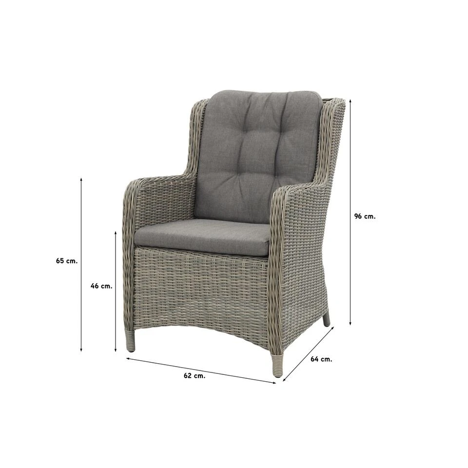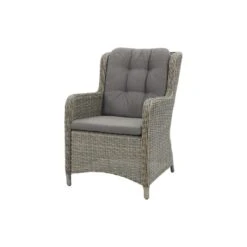 De Sandigo dining tuinstoel. De stoel kenmerkt zich door het lekkere zitcomfort en de natuurlijke uitstraling van de tuinstoel. Het rugkussen van de Sandigo tuinstoel is gecapitonneerd. Dit geeft de tuinstoel een luxe uitstraling. Het frame van de stoel is gemaakt van aluminium. Om dit frame is het vlechtwerk gevlochten. Het wicker is uitgevoerd in de kleur kiezel. Deze kleur is beste te omschrijven als een natuurlijke tint. Het kussen is taupe wat goed combineert bij het vlechtwerk.